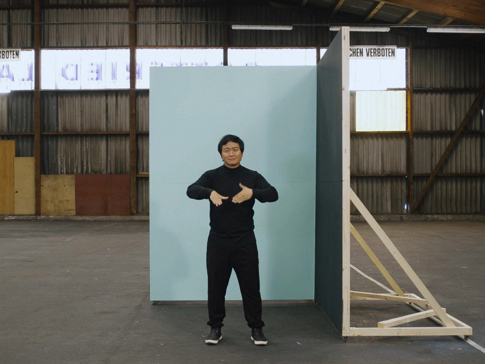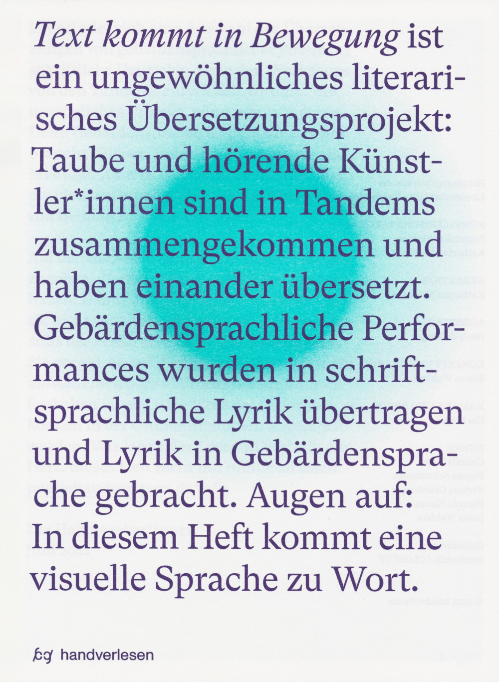 Szenenbild und visuelles Konzept für das Übersetzungsprojekt Text kommt in Bewegung zwischen Tauben und hörenden Künstler*innen von handverlesen.