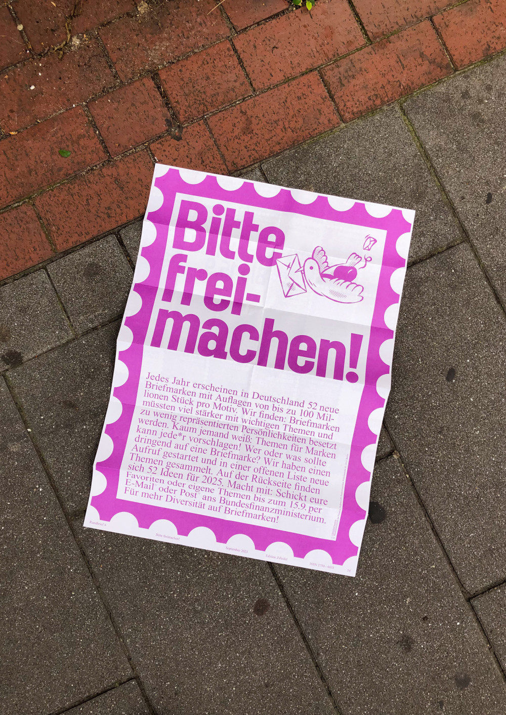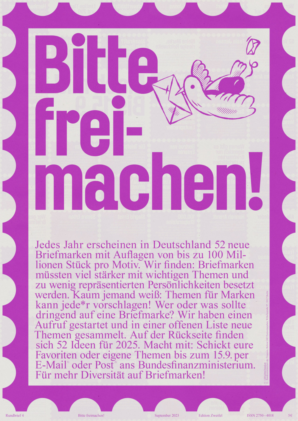 Jedes Jahr erscheinen in Deutschland 52 neue Briefmarken mit Auflagen von bis zu 100 Millionen Stück pro Motiv. Wir finden: Briefmarken müssten viel stärker mit wichtigen Themen und zu wenig repräsentierten Persönlichkeiten besetzt werden. Kaum jemand weiß: Themen für Marken kann jede*r vorschlagen! Wer oder was sollte dringend auf eine Briefmarke? Wir haben einen Aufruf gestartet und in einer offenen Liste neue Themen für 2025 gesammelt. Aus über 90 Ideen haben wir 52 für den Rundbrief ausgewählt und diese kollektiv ans Bundesfinanzministerium geschickt. Für mehr Diversität auf Briefmarken!
