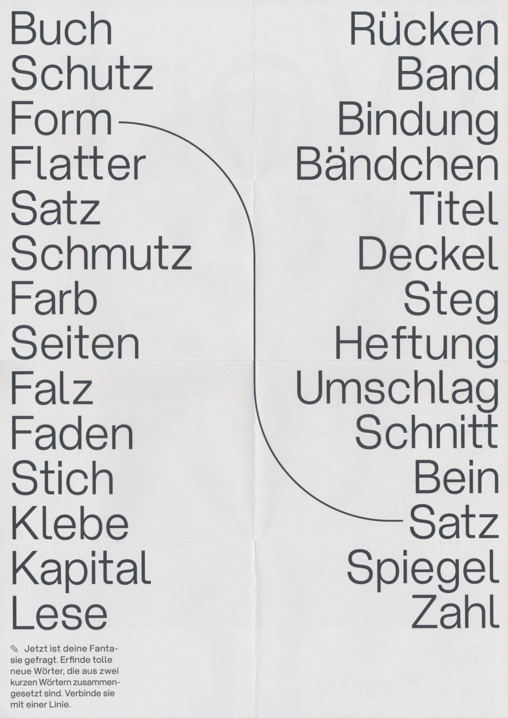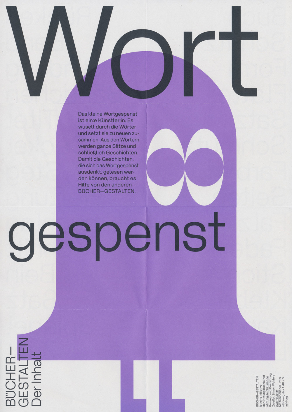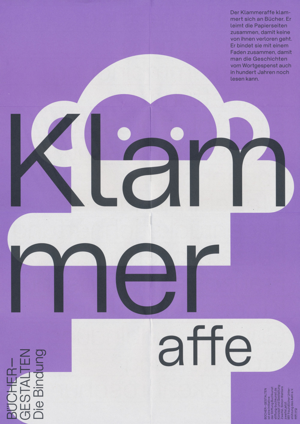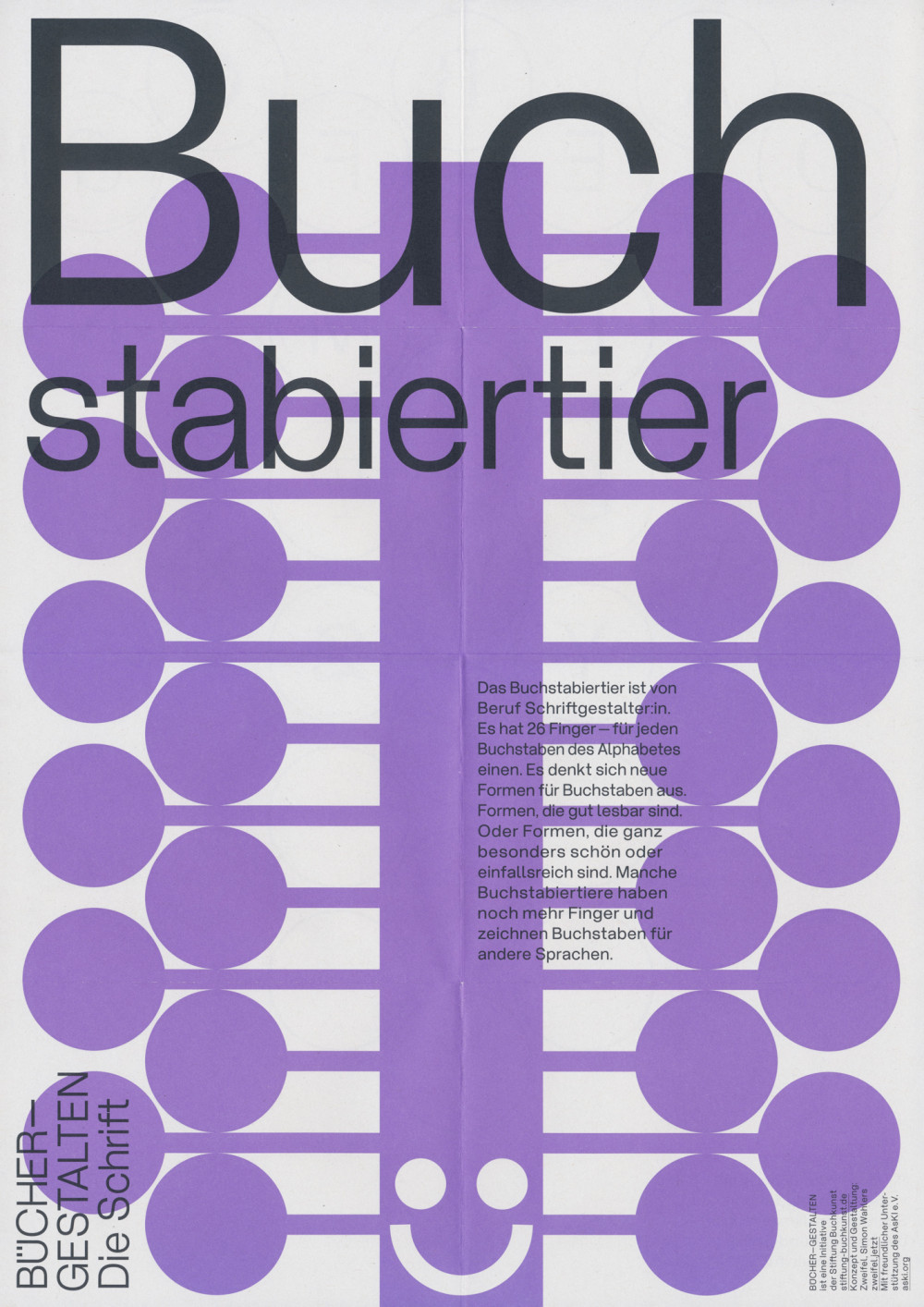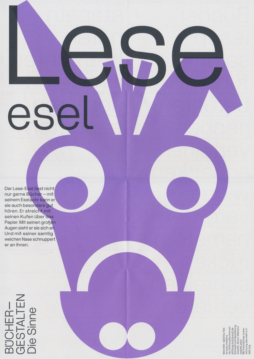 Für die Stiftung Buchkunst haben wir die Bücher—Gestalten erfunden. Das Wortgespenst, die Blattraupe, das Buchstabiertier, der Lese-Esel und der Klammeraffe vermitteln einem jungen Publikum spielerisch Inhalte der Buchgestaltung und -produktion. Die beidseitig bedruckten A3-Plakate kommen im Buchhandel, in Bibliotheken, auf Messen und an Orten des Lernens zum Einsatz.