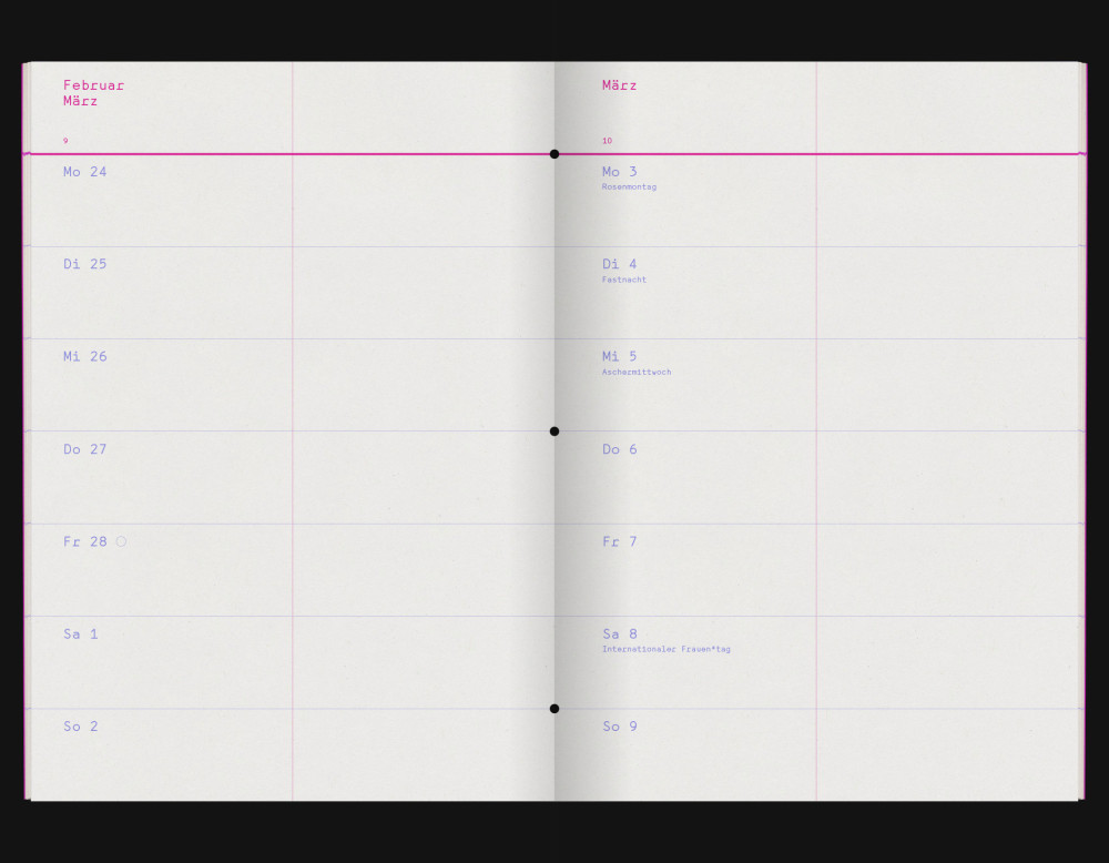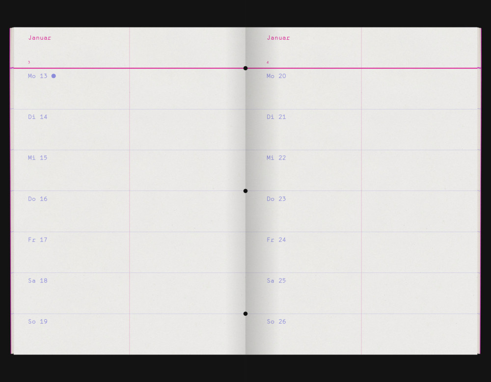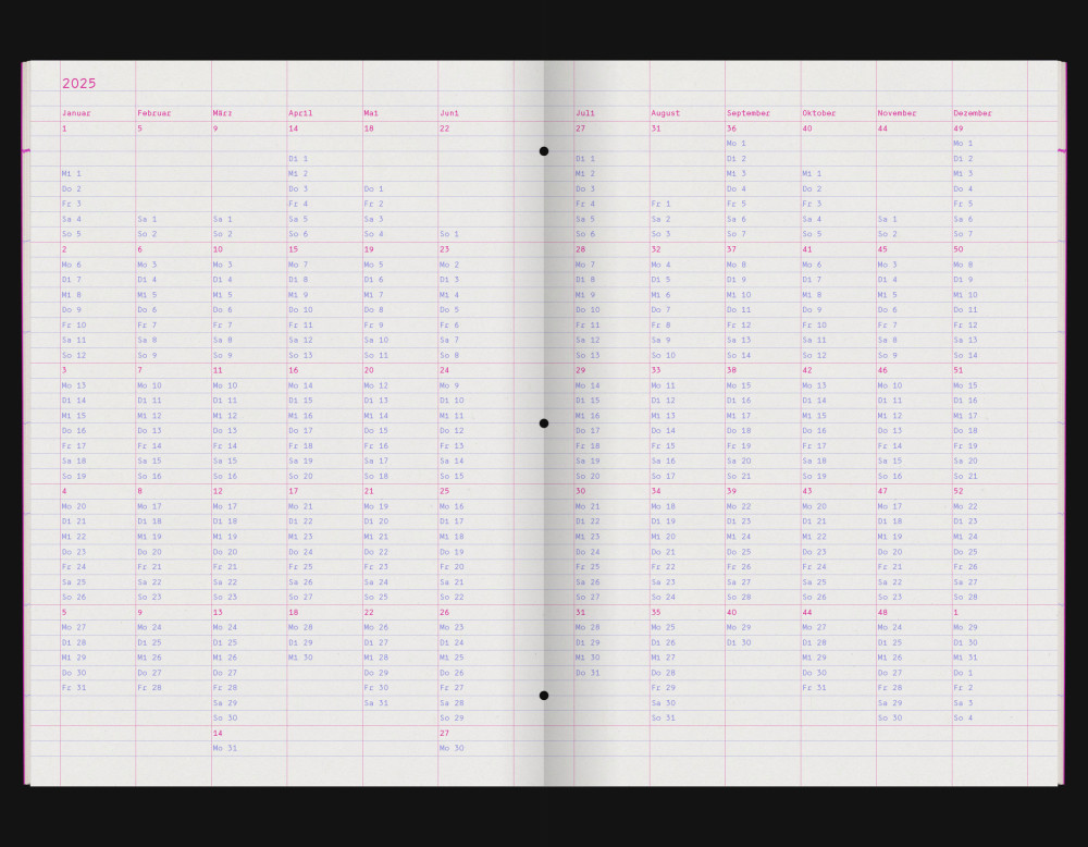 Ein ungebundener Kalender für lose Termine und feste Verabredungen. Zusammengehalten mit einem Fadenknoten zum selbst binden oder einer Gummischnur. Ein leichtes Heft, das Platz lässt – ohne Ratschläge und Wohlfühltipps. Dafür mit doppelseitigen Jahresübersichten für 2025 und 2026, großzügigem Kalendarium mit wichtigen Daten und Mondphasen, 16 blanko sowie 4 karierten Notizseiten.