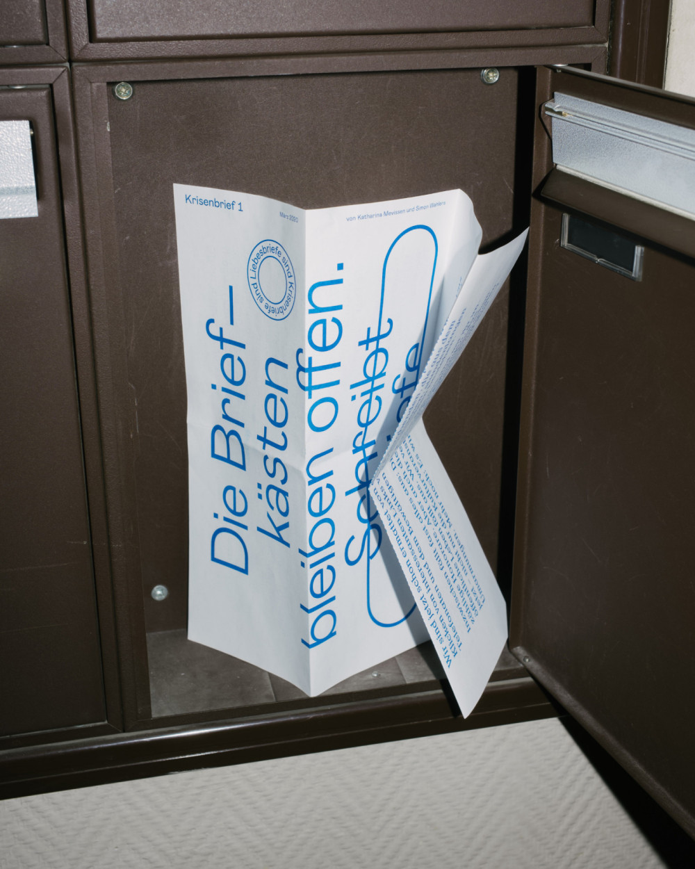 Krisenbriefe waren Briefe, aber auch Plakate. Ein Format für Kultur, Protest und Gemeinschaft in der Krise. Papier ist geduldig: Krisenbriefe waren dann da, wenn alles andere abgesagt oder ins Netz verlegt wurde. Die erste Ausgabe entstand im März 2020 aus akutem Anlass und aus Sehnsucht – Krisenbriefe waren Liebesbriefe. Die fünfzehnte und letzte Ausgabe erschien im Dezember 2021.