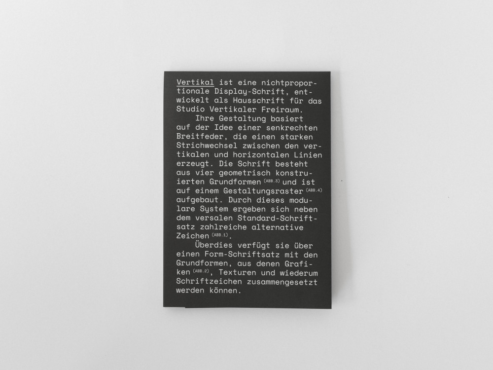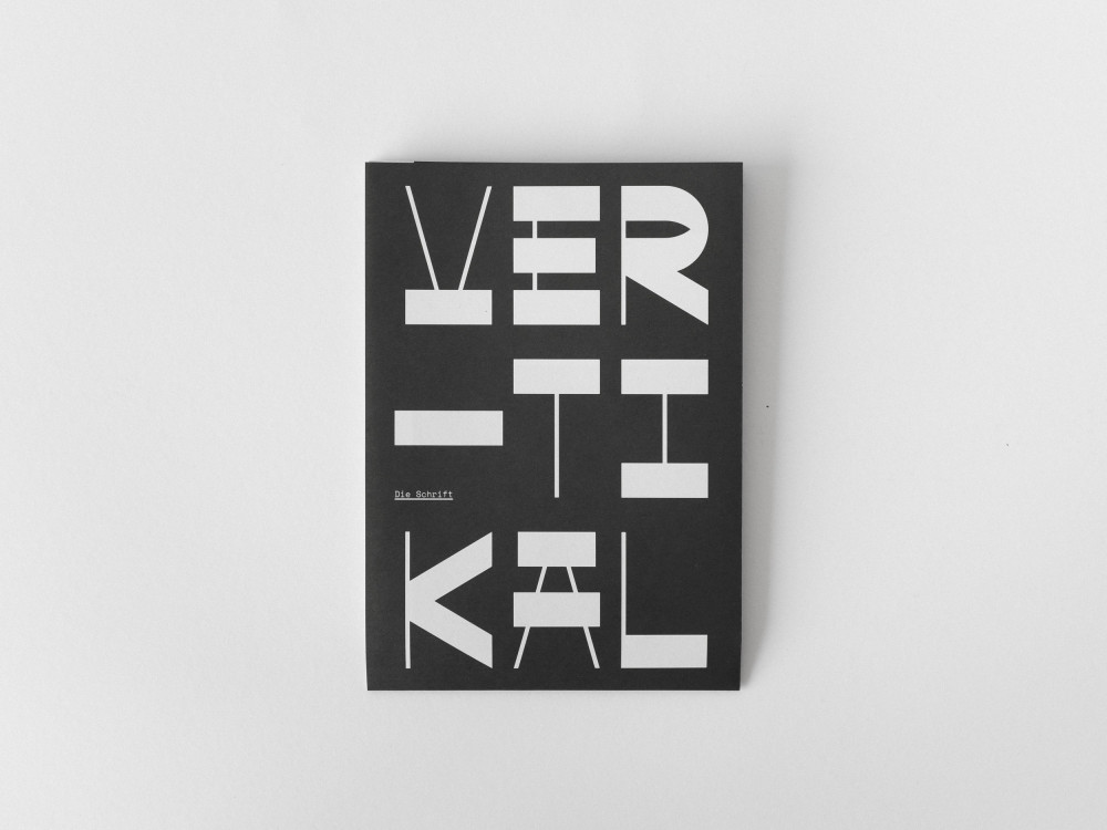 Vertikal ist eine nichtproportionale Display-Schrift, entwickelt als Hausschrift für das Studio Vertikaler Freiraum und die Publikation Freiraum vertikal denken. Ihre Gestaltung basiert auf der Idee einer senkrechten Breitfeder, die einen starken Strichwechsel zwischen den vertikalen und horizontalen Linien erzeugt. Die Schrift besteht aus vier geometrisch konstruierten Grundformen und ist auf einem Gestaltungsraster aufgebaut. Durch dieses modulare System ergeben sich neben dem versalen Standard-Schriftsatz zahlreiche alternative Zeichen. Überdies verfügt sie über einen Form-Schriftsatz mit den Grundformen, aus denen Grafiken, Texturen und wiederum Schriftzeichen zusammengesetzt werden können.