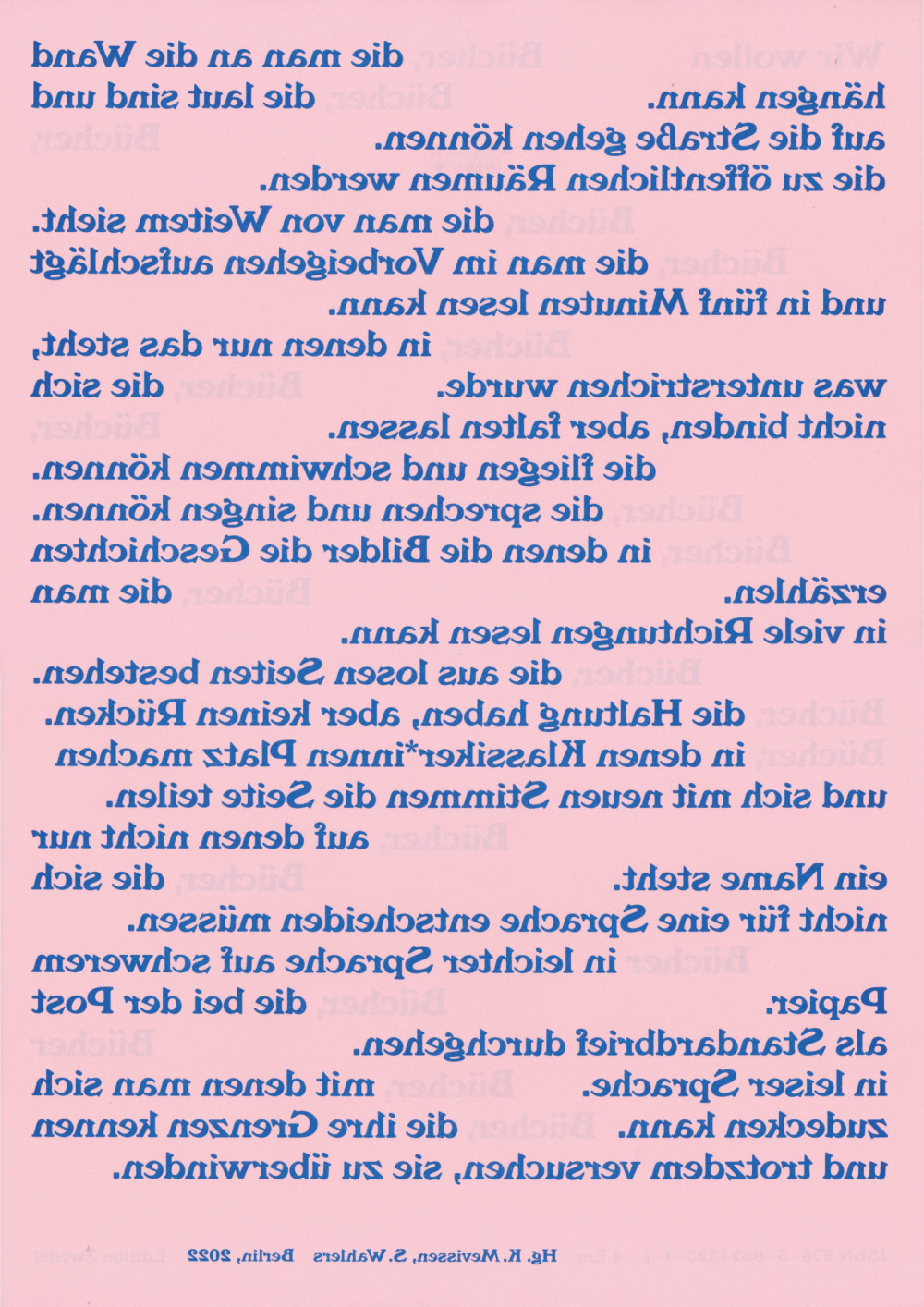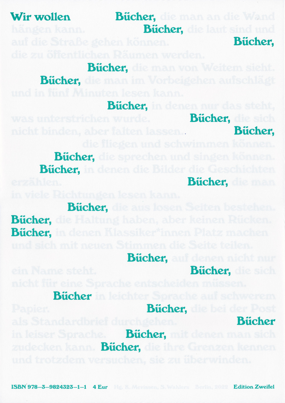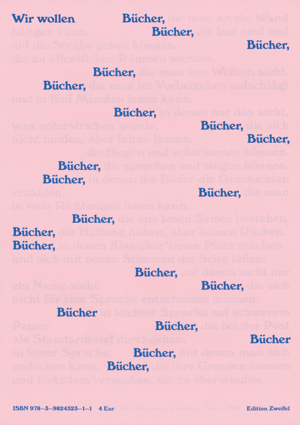 Was kann das gedruckte Buch? Was können Bücher, wenn sie sich nicht mit den digitalen Medien messen, sondern sich mit den losen, wenig prestigeträchtigen Printmedien des öffentlichen Raums verbünden? Ein leidenschaftliches Brainstorming der Edition Zweifel für die (analogen!) Bücher von morgen. Und eine Einladung, den Begriff des Buchs offener und größer zu denken – mindestens auf A3.