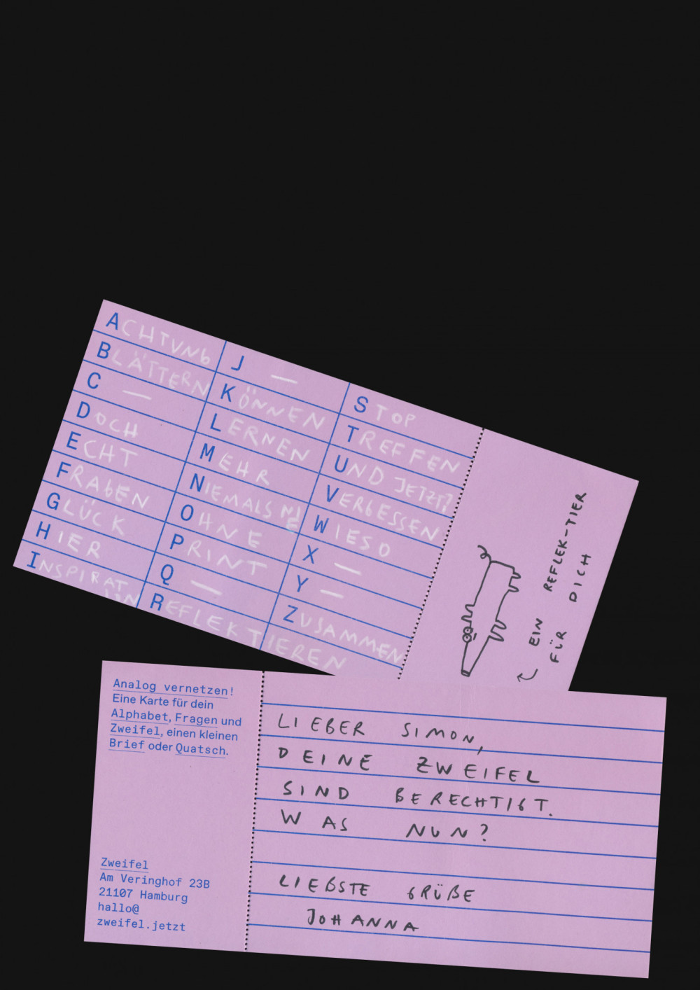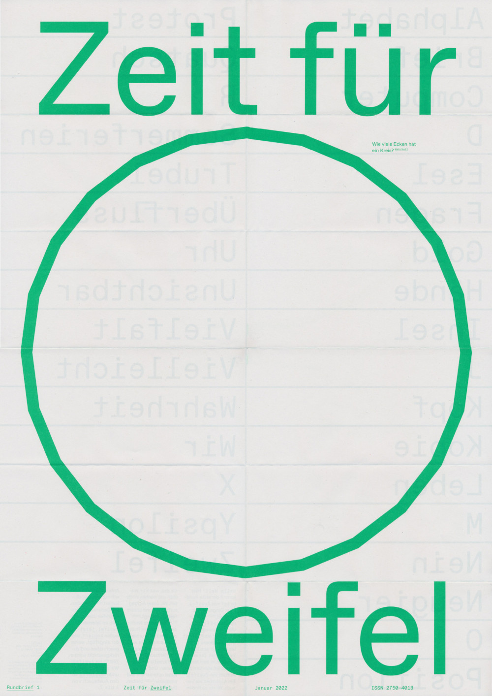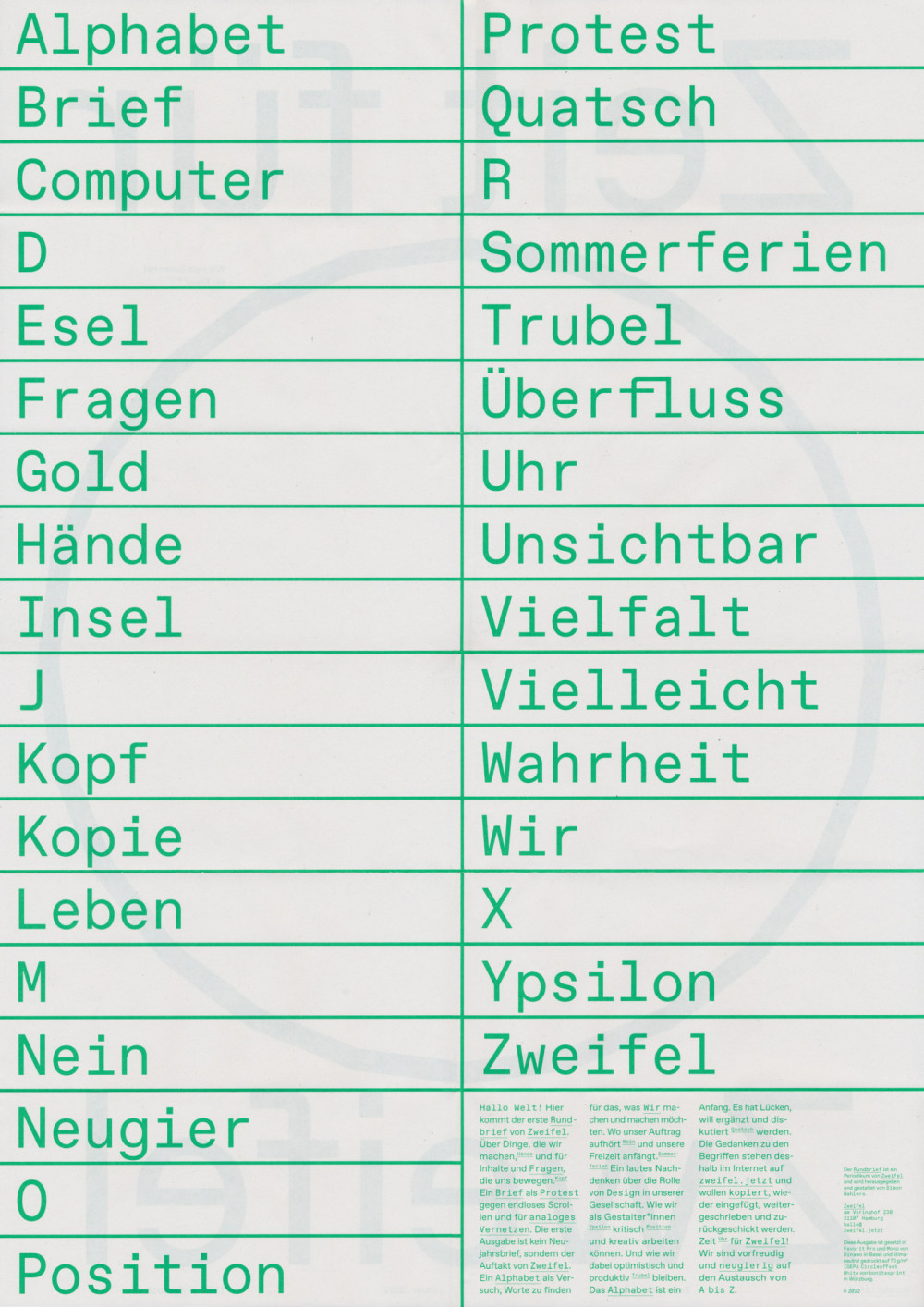 Die erste Ausgabe des Rundbriefs ist der Auftakt von Zweifel. Ein Alphabet als Versuch, Worte zu finden für das, was wir machen und machen möchten. Ein Anstoß zum analogen Vernetzen und gemeinsamen Nachdenken.